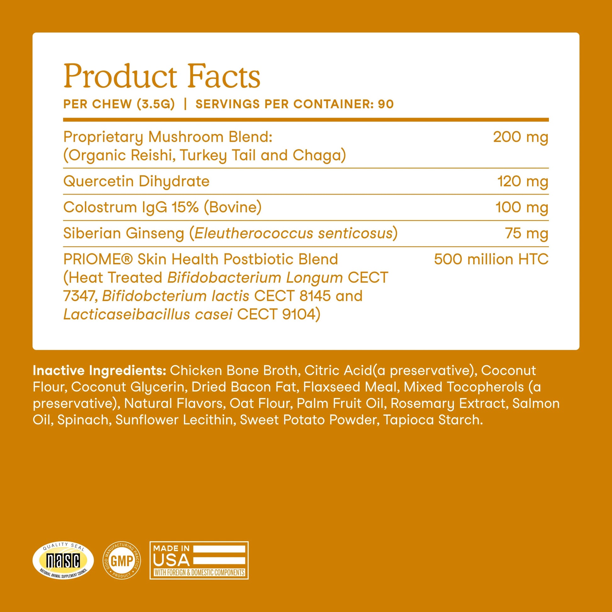 Inactive Ingredients: Chicken Bone Broth, Citric Acid (a preservative), Coconut Flour, Coconut Glycerin, Dried Bacon Fat, Flaxseed Meal, Mixed Tocopherols (a preservative), Natural Flavors, Oat Flour, Palm Fruit Oil, Rosemary Extract, Salmon Oil, Spinach, Sunflower Lecithin, Sweet Potato Powder, Tapioca Starch